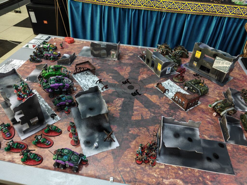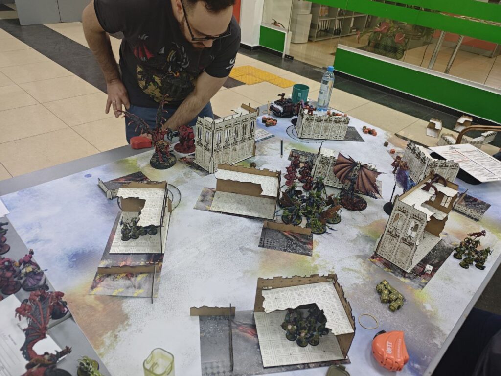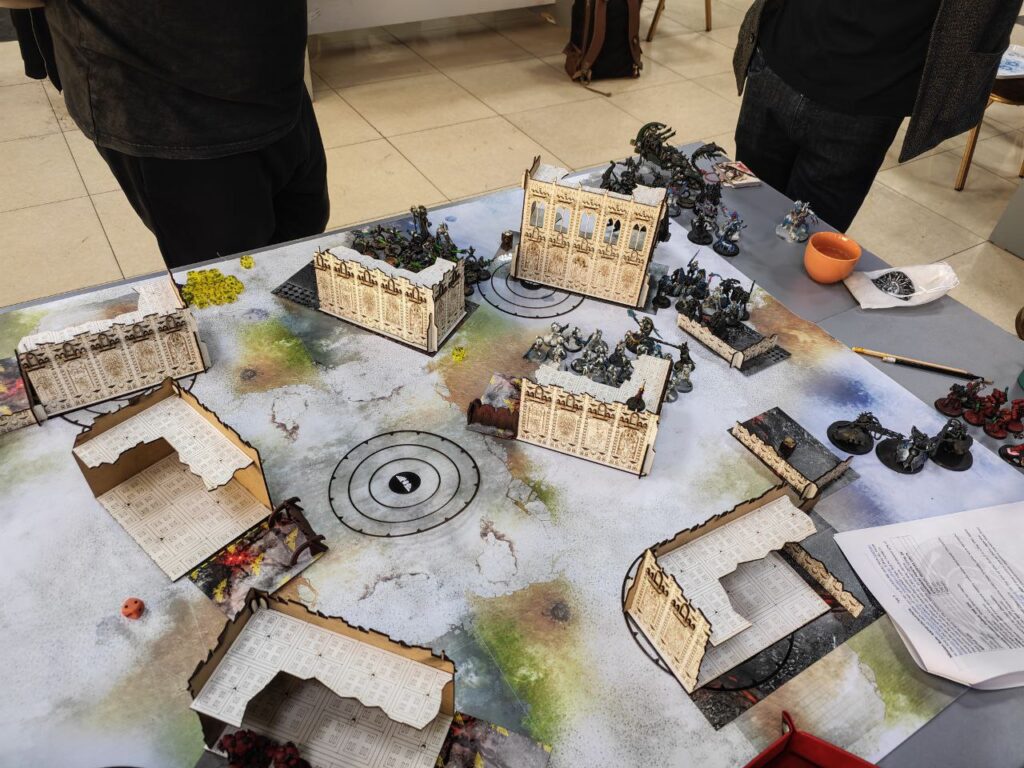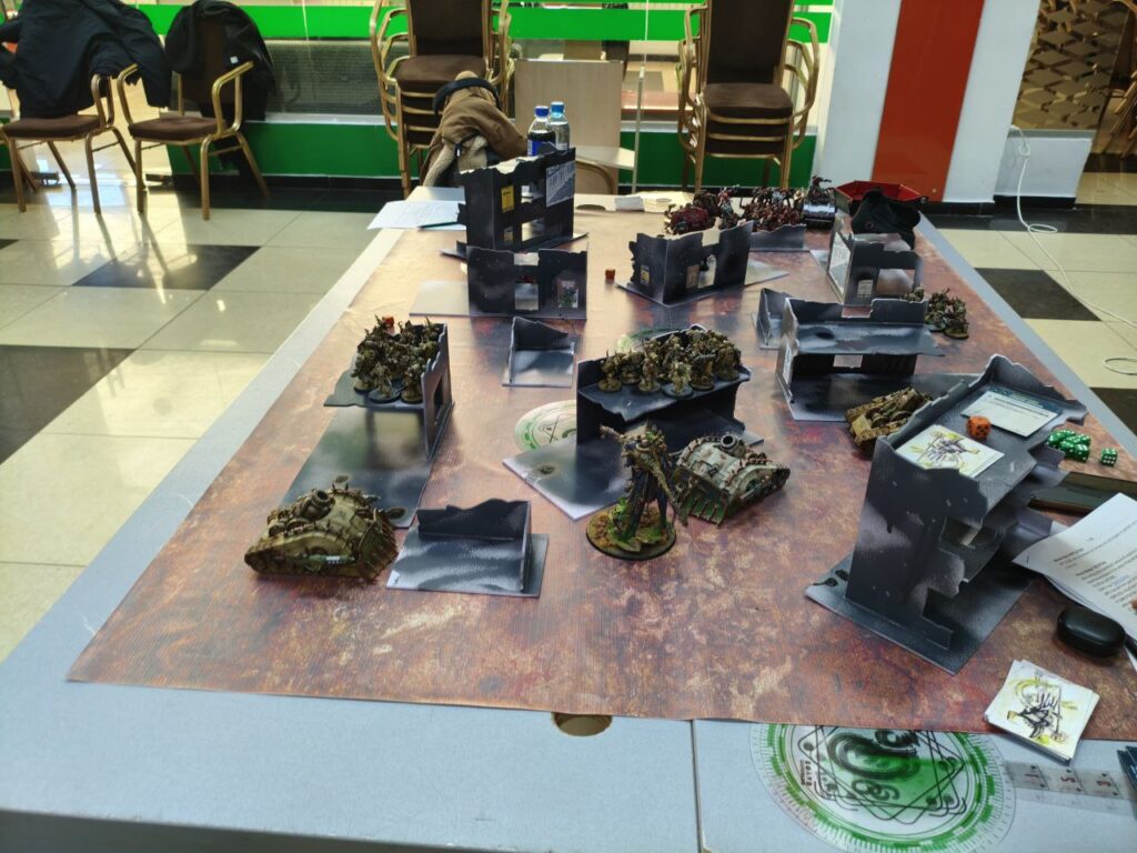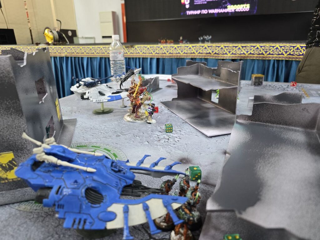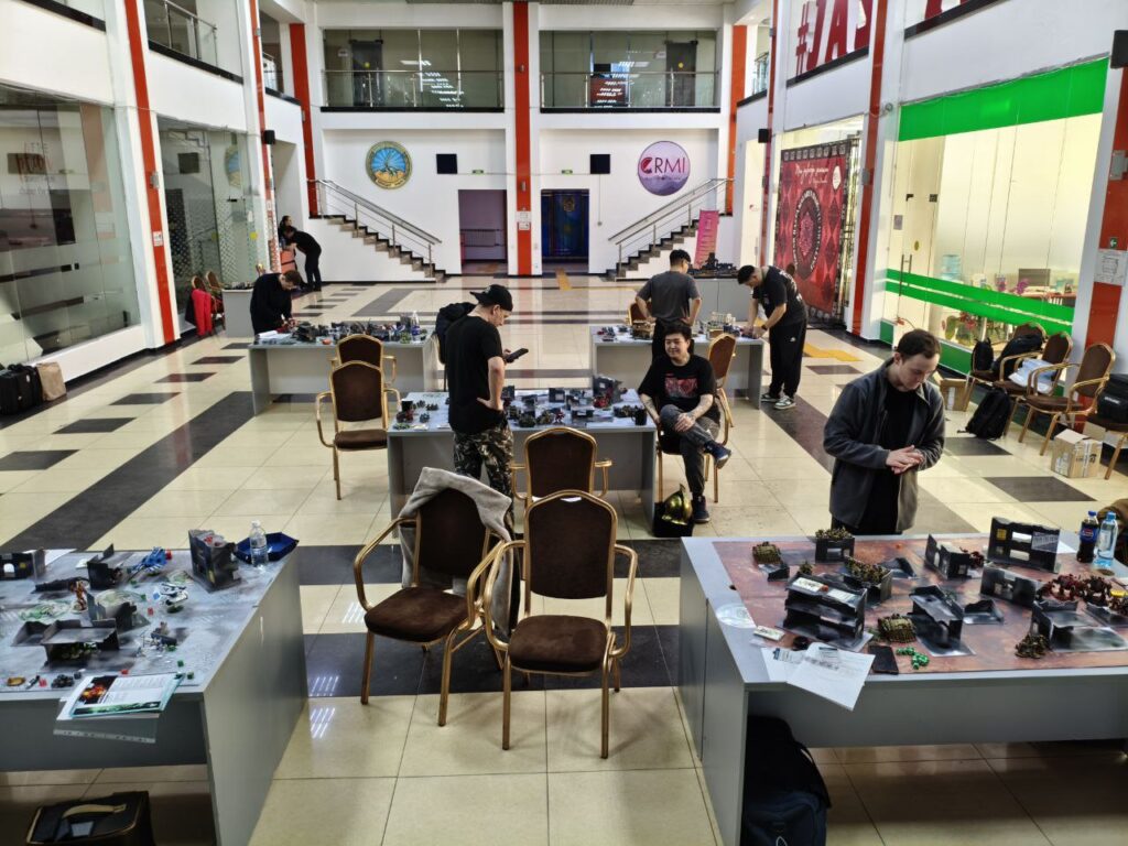 Один из столов был оснащён террейном, изготовленным мастером из Актобе. За пару недель до турнира я помогал уточнить размеры, чтобы они соответствовали рекомендациям Pariah Nexus. В итоге террейн оказался удобным и соответствовал ожиданиям.